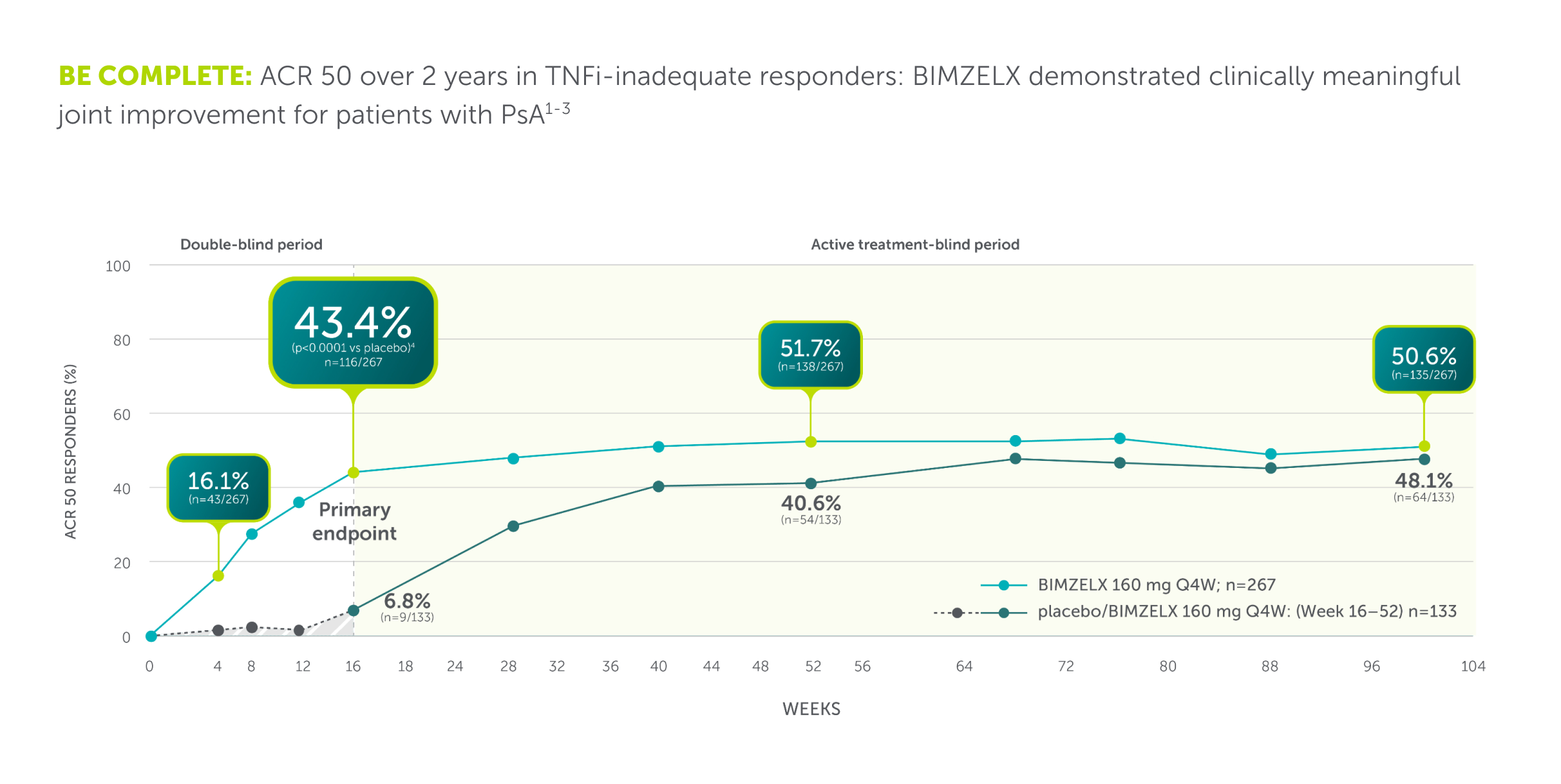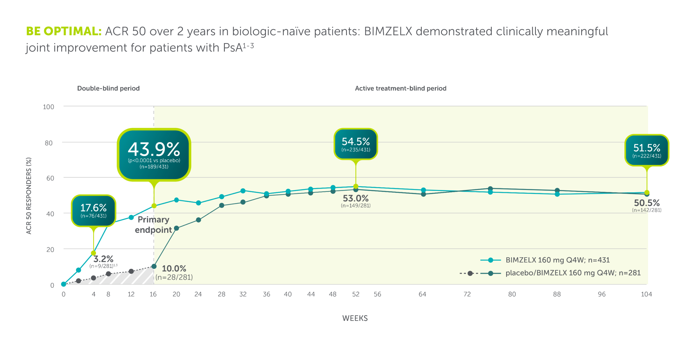 BE OPTIMAL: Phase III study (N=852) assessing efficacy and safety of BIMZELX in patients with active PsA who were naïve to bDMARDs. The primary endpoint was ACR 50 at Week 16. Patients were randomised 3:2:1 to BIMZELX 160 mg Q4W (n=431), placebo Q2W (n=281), or adalimumab 40 mg Q2W (active reference; n=140). After Week 16, all patients were aware that they were receiving active treatment, which may have affected the results. Missing data were imputed with NRI and p values were generated using logistic regression.2