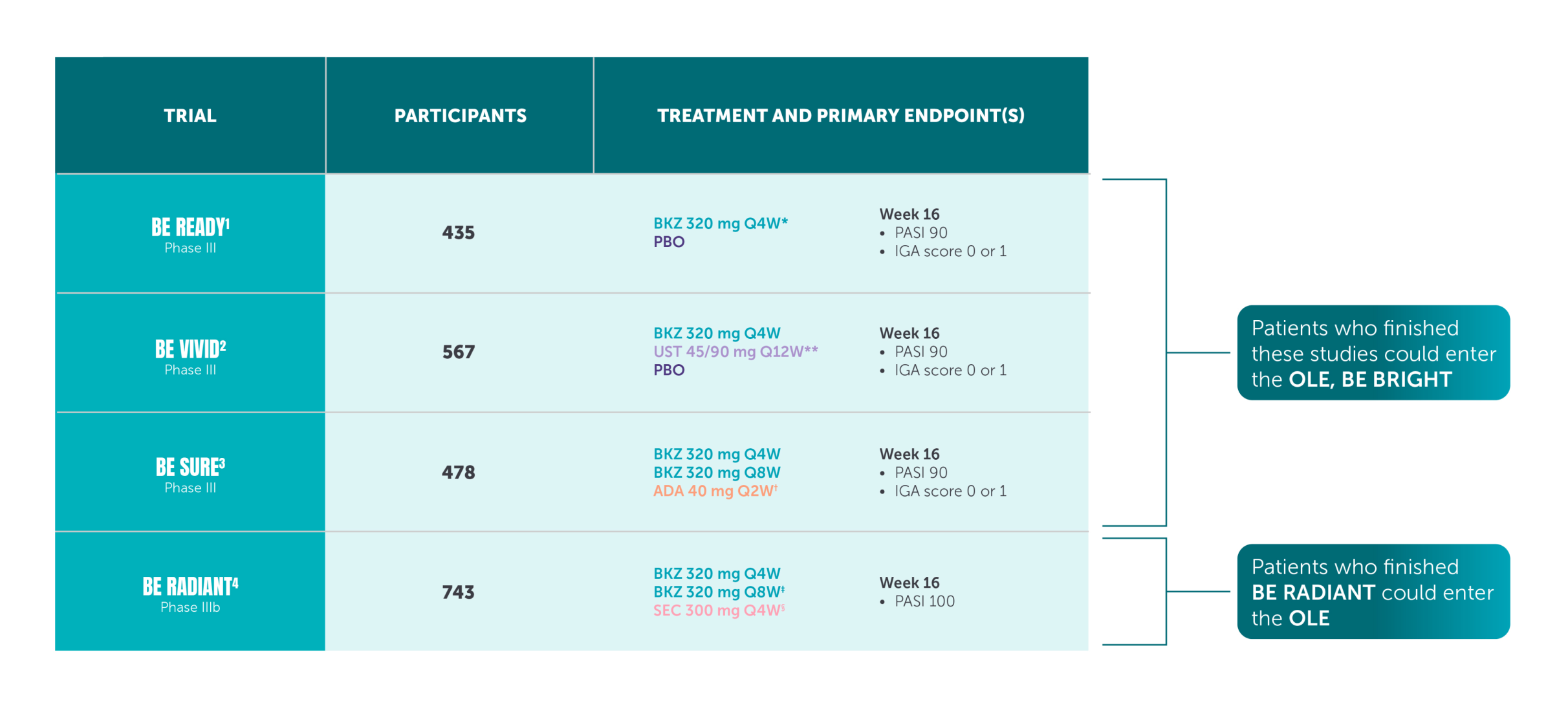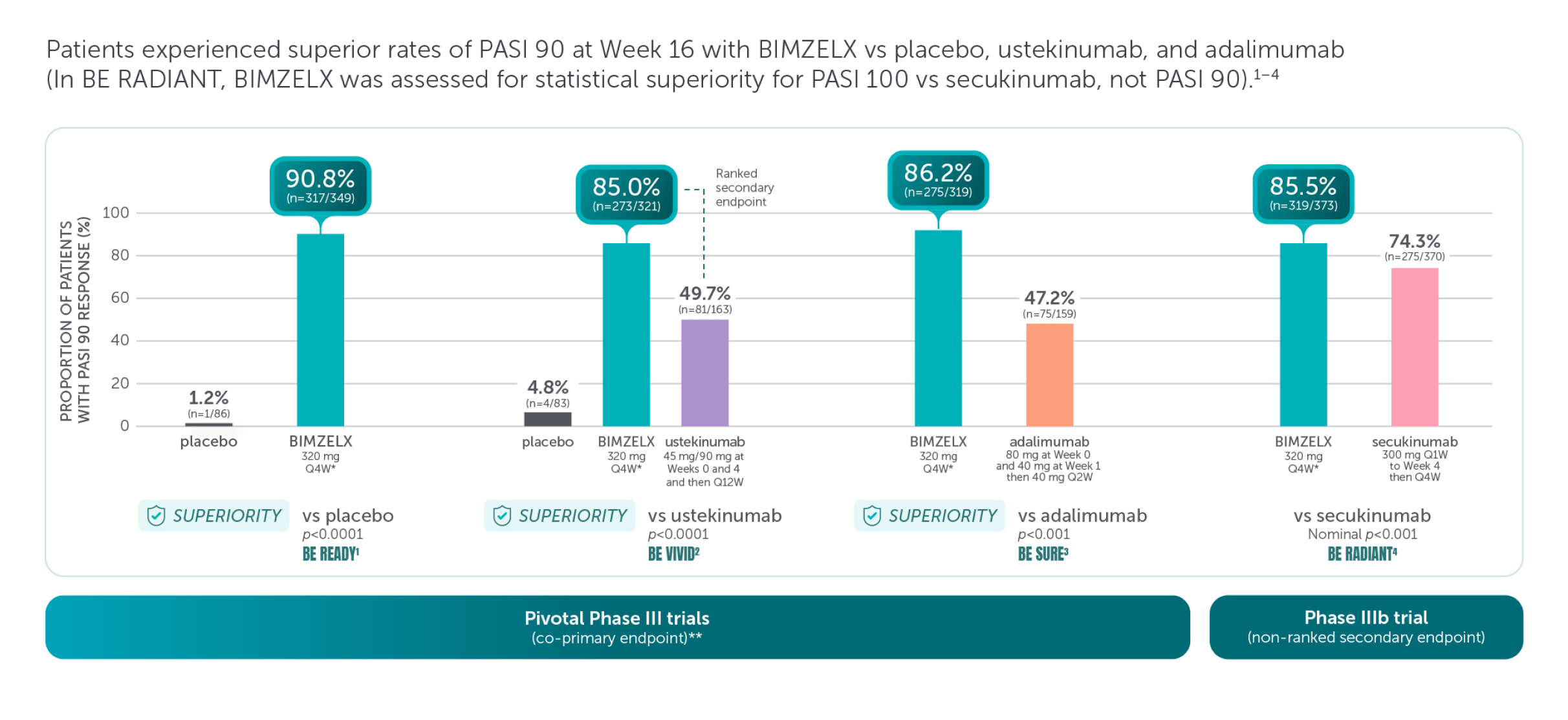 **The co-primary efficacy endpoints for the pivotal phase III studies BE READY, BE VIVID, and BE SURE were PASI 90 and IGA score of clear or almost clear (IGA 0/1) at Week 16.1–4 †The primary endpoint of BE RADIANT was PASI 100 response at Week 16 with BIMZELX vs secukinumab.4