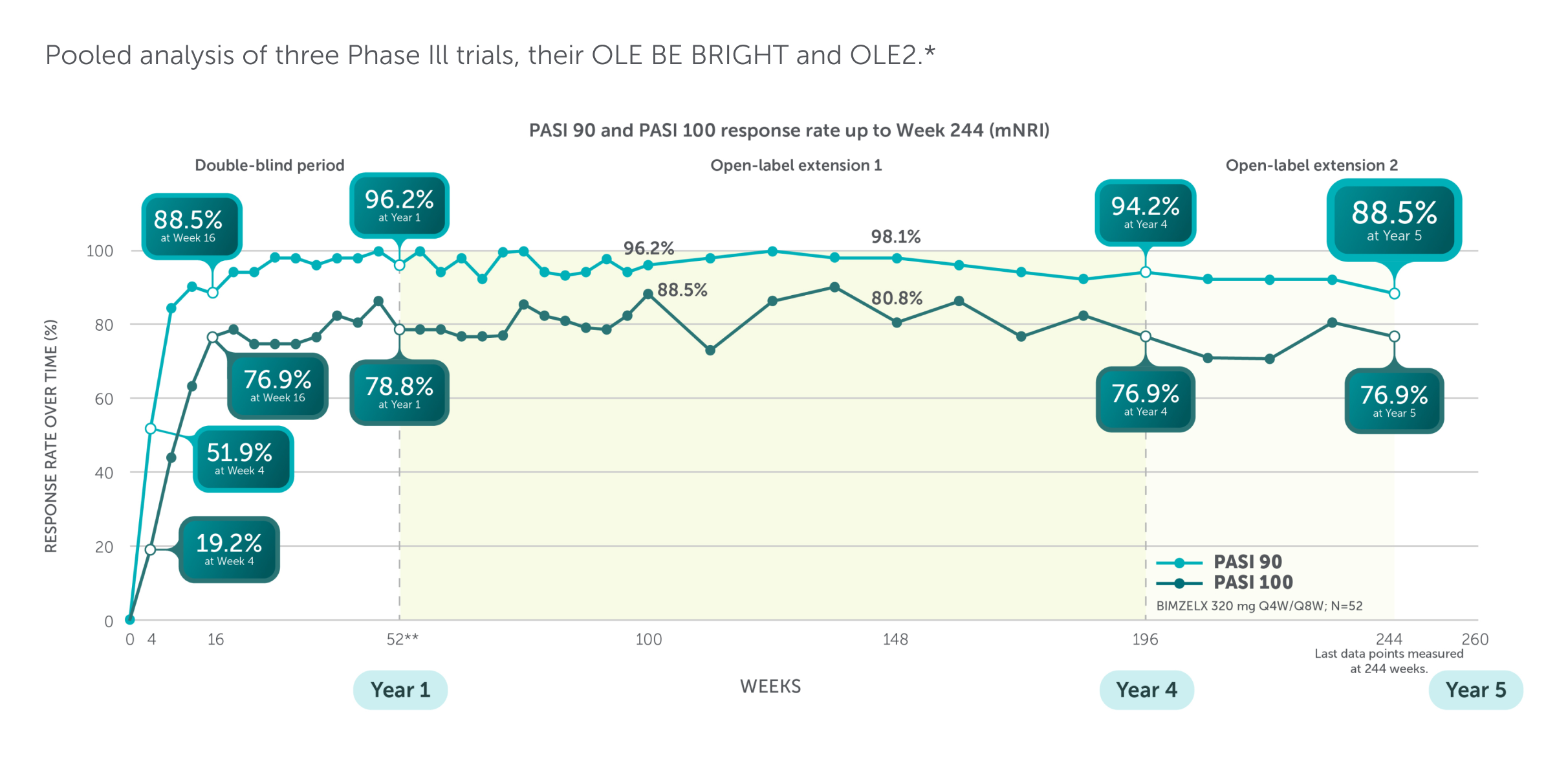 *Patients who completed BE SURE, BE VIVID, or BE READY were eligible to enrol in BE BRIGHT, an OLE study designed to assess long-term safety, tolerability, and efficacy of BIMZELX. US/Canadian patients who completed the BE BRIGHT OLE (4 years’ total treatment), could enter a second 48-week OLE (OLE2). The mean weight of US/Canadian patients in OLE2 was numerically higher than the global BE BRIGHT population (mean weight was 88.5 ± 20.8 kg [BIMZELX Q4W/Q8W]). **BE VIVID lasted 52 weeks and BE SURE and BE READY lasted 56 weeks; to pool data across studies, Week 56 data were not included. In this graph, the period after Week 52 (or Week 48/52) corresponds to the BE BRIGHT OLE.