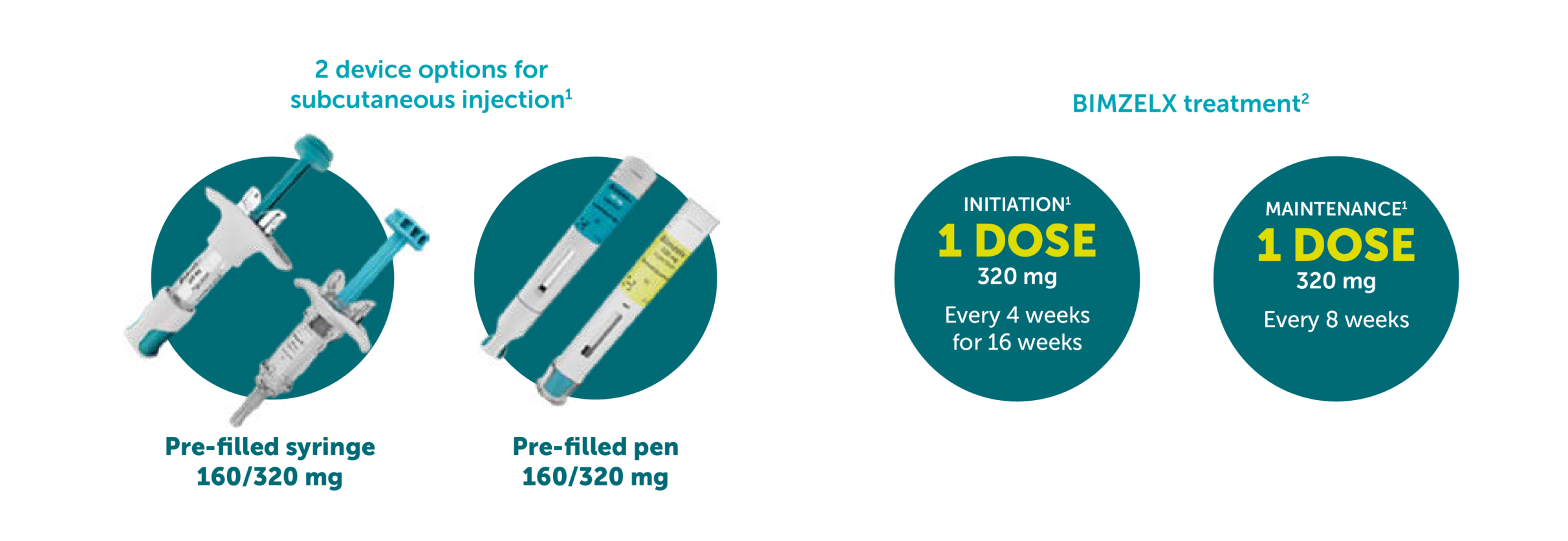 The recommended BIMZELX dose for adult patients with plaque PsO is 320 mg (given as two subcutaneous injections of 160 mg or one subcutaneous injection of 320 mg) at Week 0, 4, 8, 12, 16 and every 8 weeks thereafter. This equates to 9 doses in Year 1 then 6 or 7 doses per year thereafter.