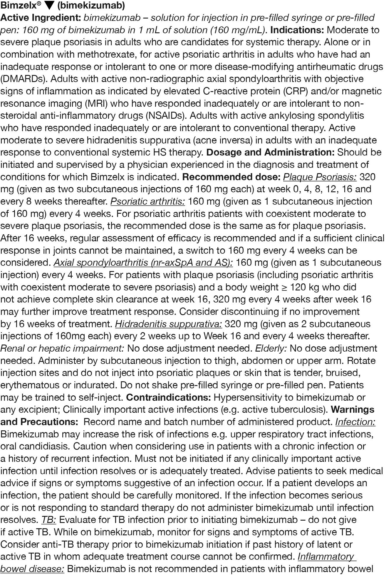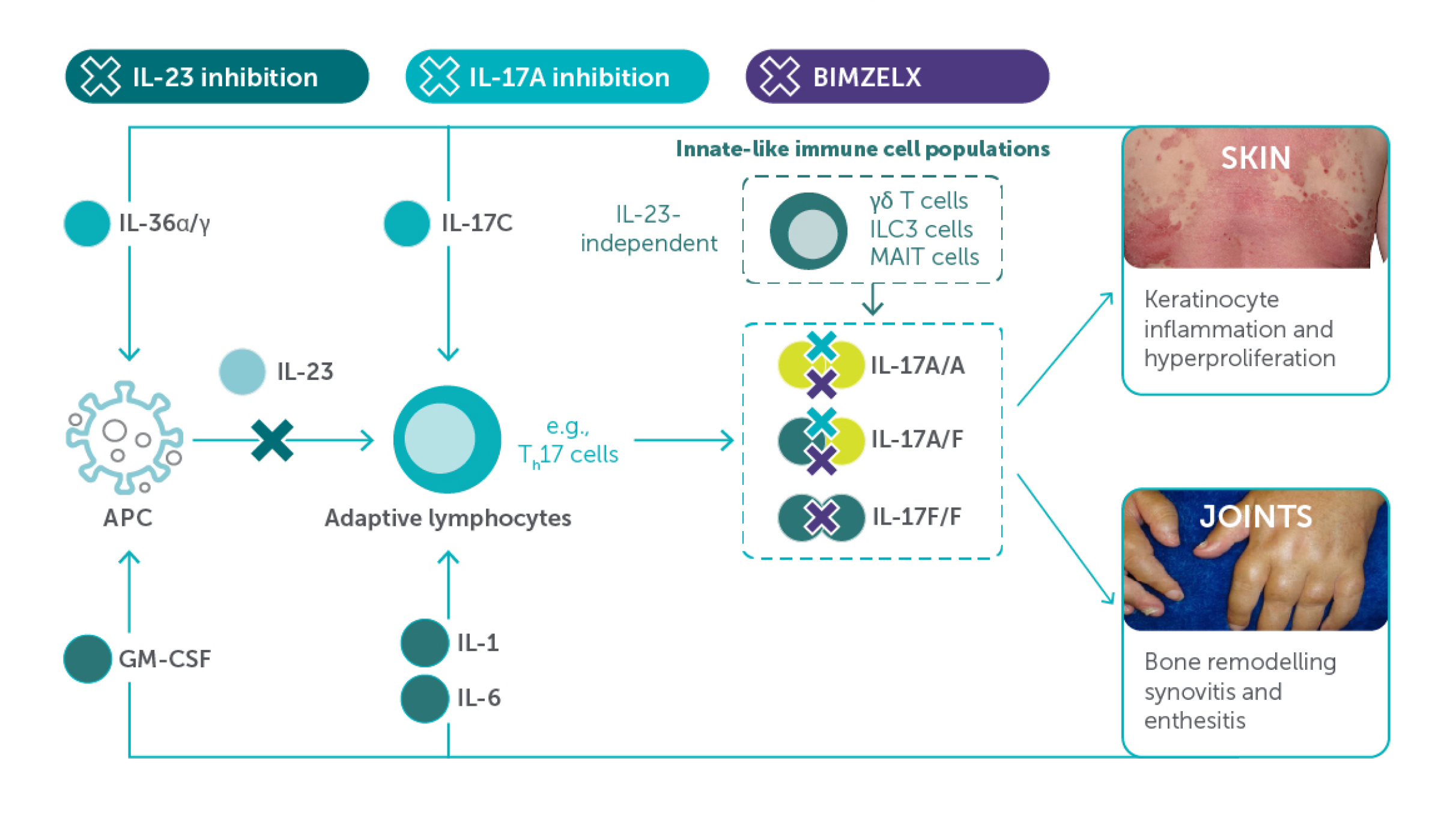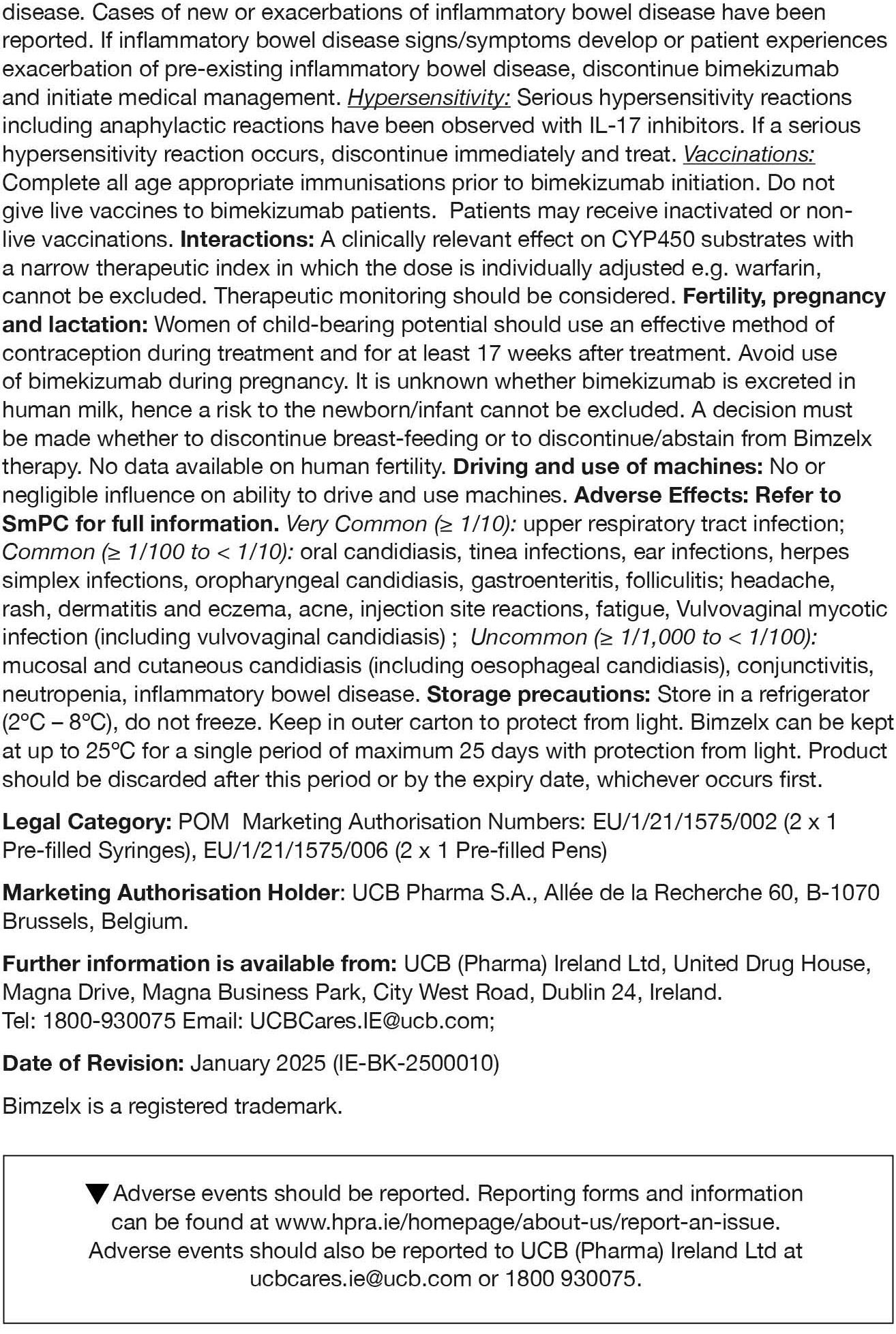 References: 1. BIMZELX SmPC. 2. Mease P, et al. Rheumatol. 2024;63:1779–89. 3. Cole S, et al. Front Immunol. 2020;11:585134. 4. Glatt S, et al. Ann Rheum Dis. 2018;77:523–32. 5. Oliver R, et al. Br J Dermatol. 2022;186:652–63. 6. Marinoni B, et al. Auto Immun Highlights. 2014;5:9–19. 7. Fuentelsaz-Romero S, et al. Front Immunol. 2021;11:613975. 8. Benham H, et al. Arthritis Res Ther. 2013;15:R136. 9. Sakkas LI, et al. Front Pharmacol. 2019;10:872. 10. Rosine N, et al. Front Immunol. 2021;11:553742. 11. Chimenti MS, et al. Front Immunol. 2018;30:9:236.